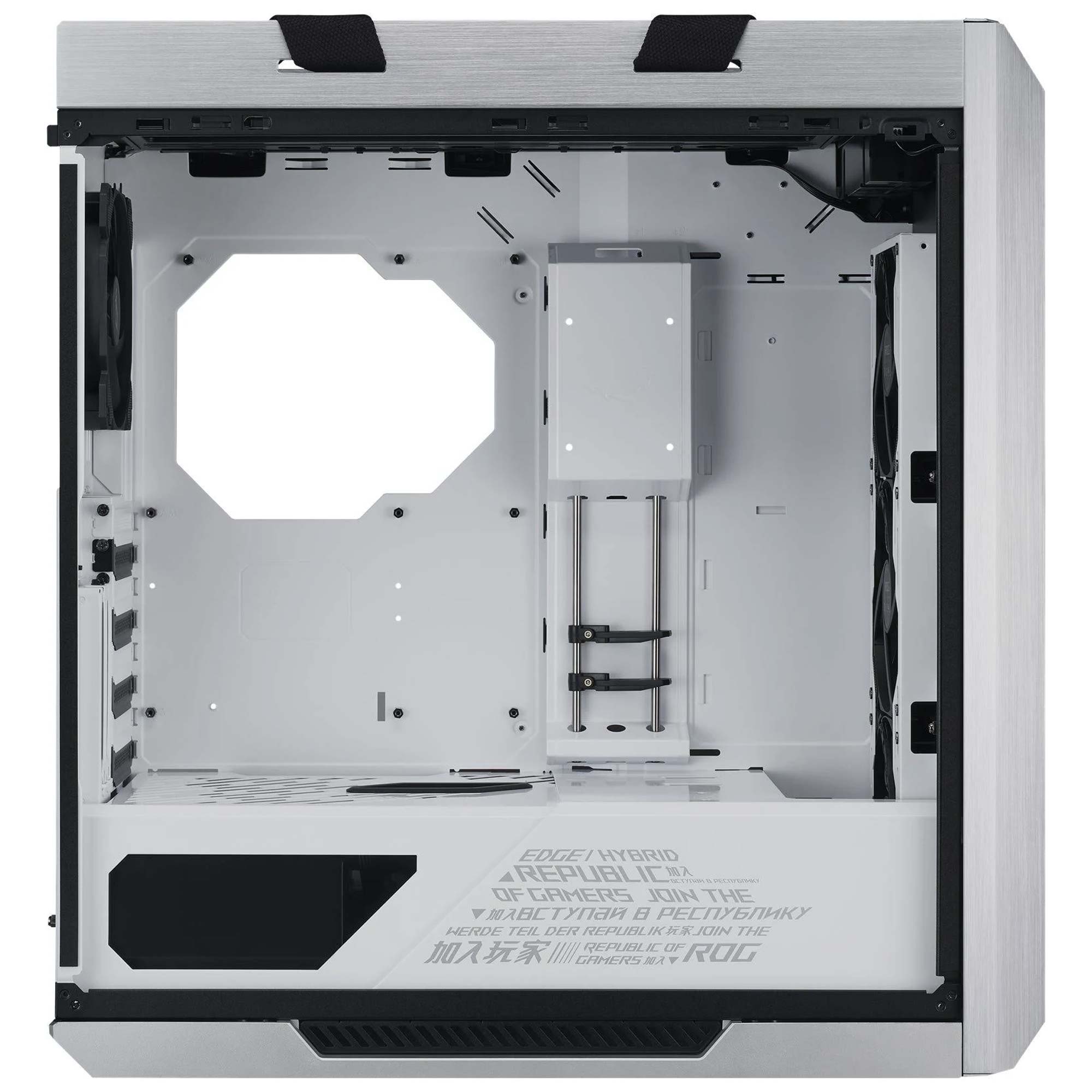Una cover multifunzione con supporti GPU nasconde abilmente il cablaggio, fornisce un solido supporto alle schede grafiche e consente ad un SSD o a ROG Aura Terminal di essere installati e messi in mostra. La sua posizione pu? essere regolata per ospitare una scheda madre ATX o EATX.