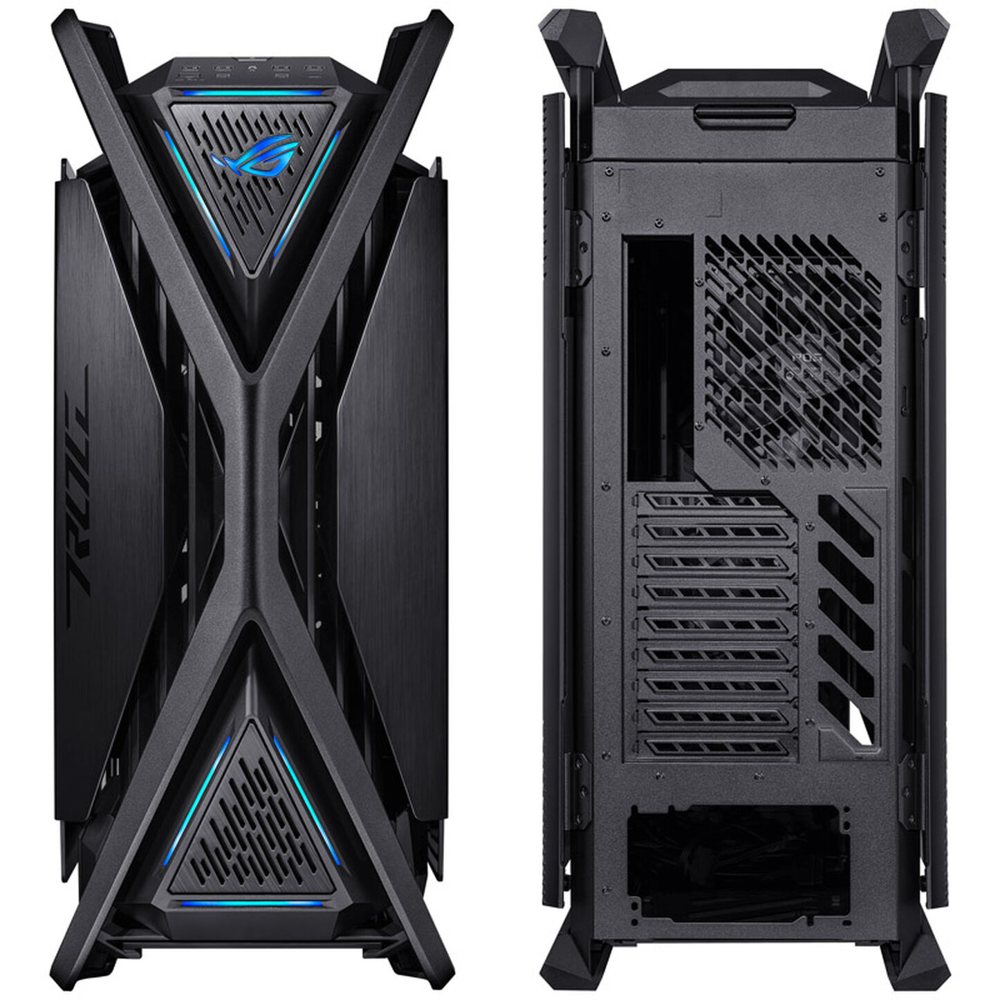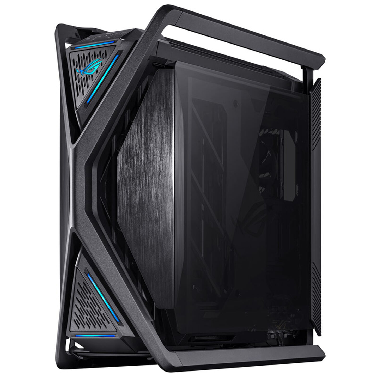 Sotto la struttura in alluminio con eleganti elementi A-RGB, si nascondono grosse prese d’aria filtrate che garantiscono il top delle prestazioni in ogni circostanza. Anche per il nuovo Hyperion, ROG ripropone dei maniglioni per il trasporto che, in questo caso, sono ricavati dal particolare frontale a "X" in grado di supportare un peso fino a 80kg.