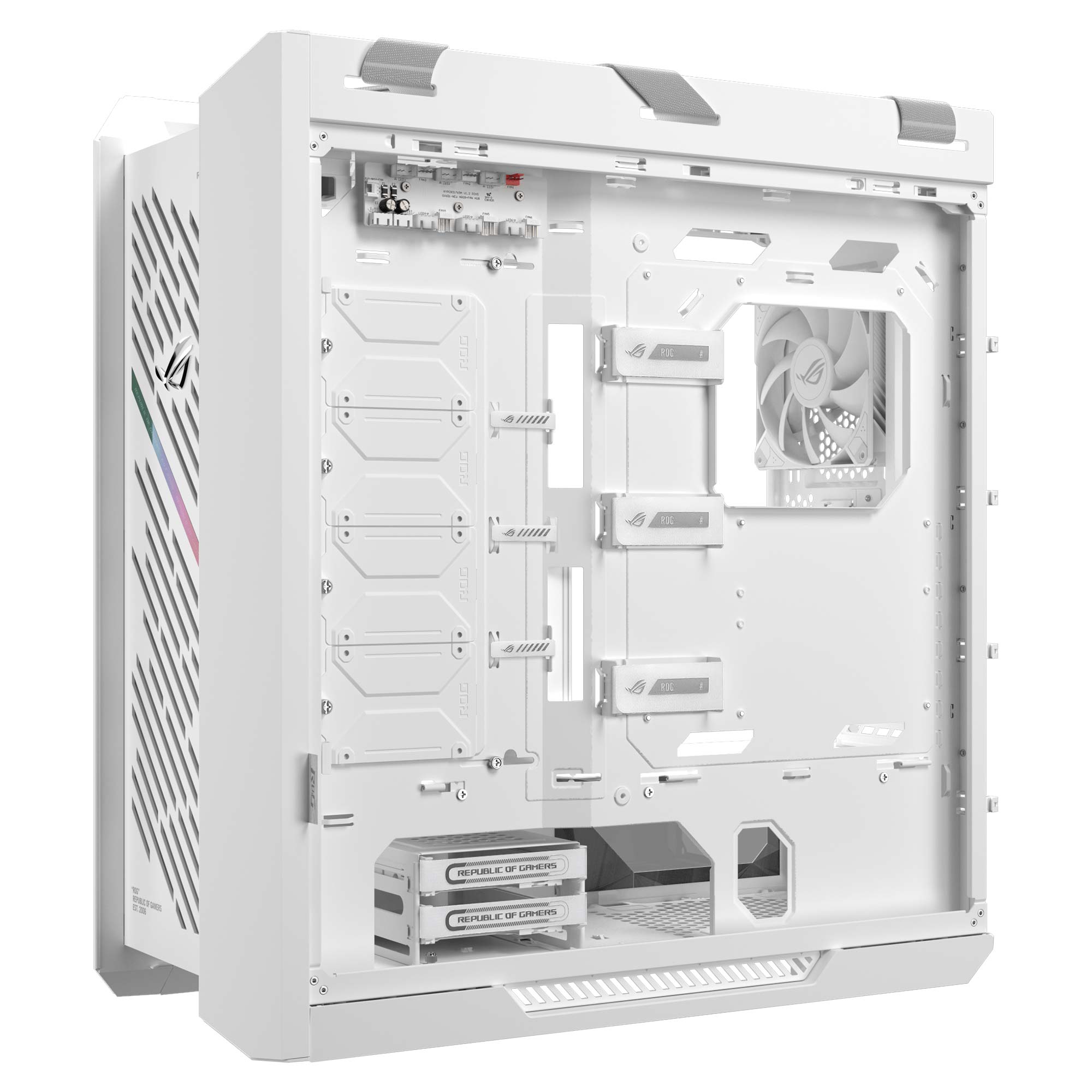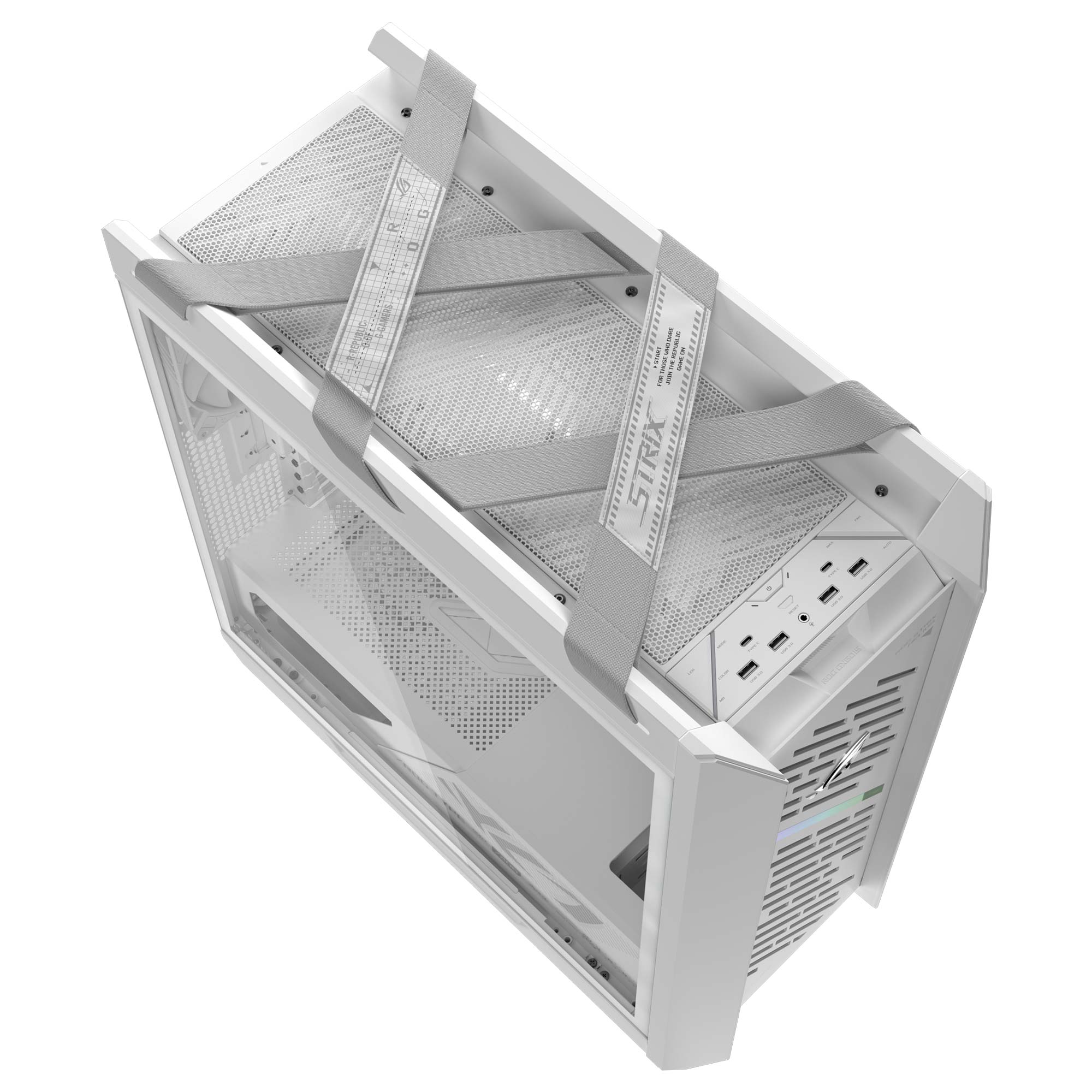 L’esperienza utente è ulteriormente potenziata dal pannello I/O frontale che integra due porte USB 3.2 Gen2×2 Type-C da 20 Gbps con ricarica rapida a 60 W, quattro porte USB 3.2 Gen1 Type-A, un jack audio combinato, pulsanti dedicati per il controllo dell’illuminazione ARGB e per la regolazione della velocità delle ventole. L’Helios II dispone inoltre di un hub integrato capace di gestire fino a 6 ventole e 6 strisce ARGB, perfettamente sincronizzabili con il sistema Aura Sync. La gestione dei cavi è resa semplice dai 33 mm di spazio dedicato, coperture multifunzione e fascette in velcro preinstallate, mentre le robuste cinghie in tessuto permettono di trasportare il case in totale sicurezza fino a un peso massimo di 50 kg. Tutti questi elementi fanno del ROG Strix Helios II un case che unisce potenza, funzionalità e design, ideale per configurazioni gaming e workstation di fascia enthusiast.