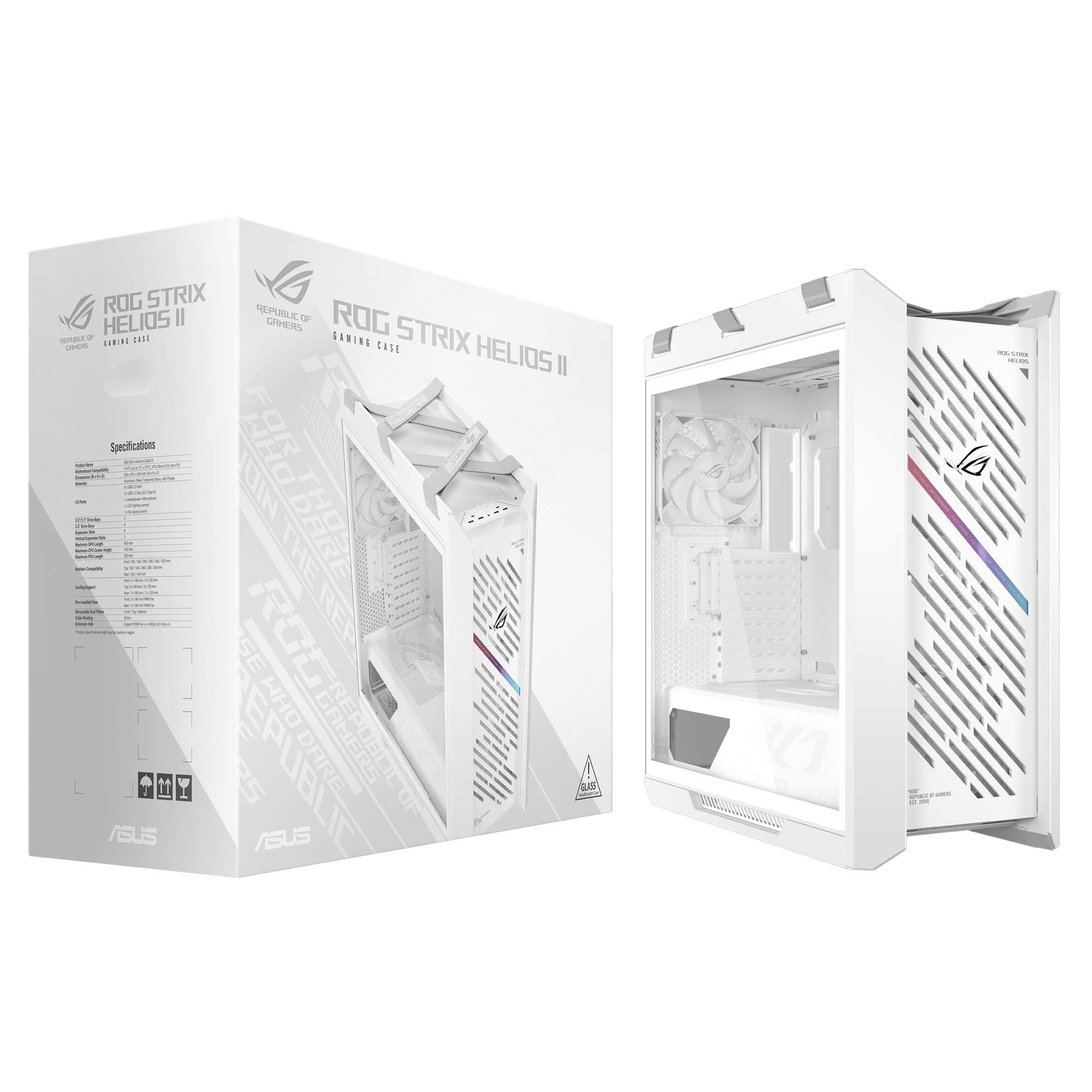 Il ROG Strix Helios II è un case mid-tower di fascia premium, sviluppato da ASUS per gli appassionati e i professionisti che vogliono costruire un sistema di fascia alta senza compromessi. Il suo design imponente e raffinato combina una struttura in alluminio CNC con pannelli in vetro temperato su tre lati, permettendo di esibire in piena vista componenti e illuminazione RGB sincronizzabile. La costruzione solida e i dettagli ricercati, come il pannello frontale con finitura diamantata e la gestione interna dei cavi ottimizzata, lo rendono non solo elegante ma anche estremamente funzionale.