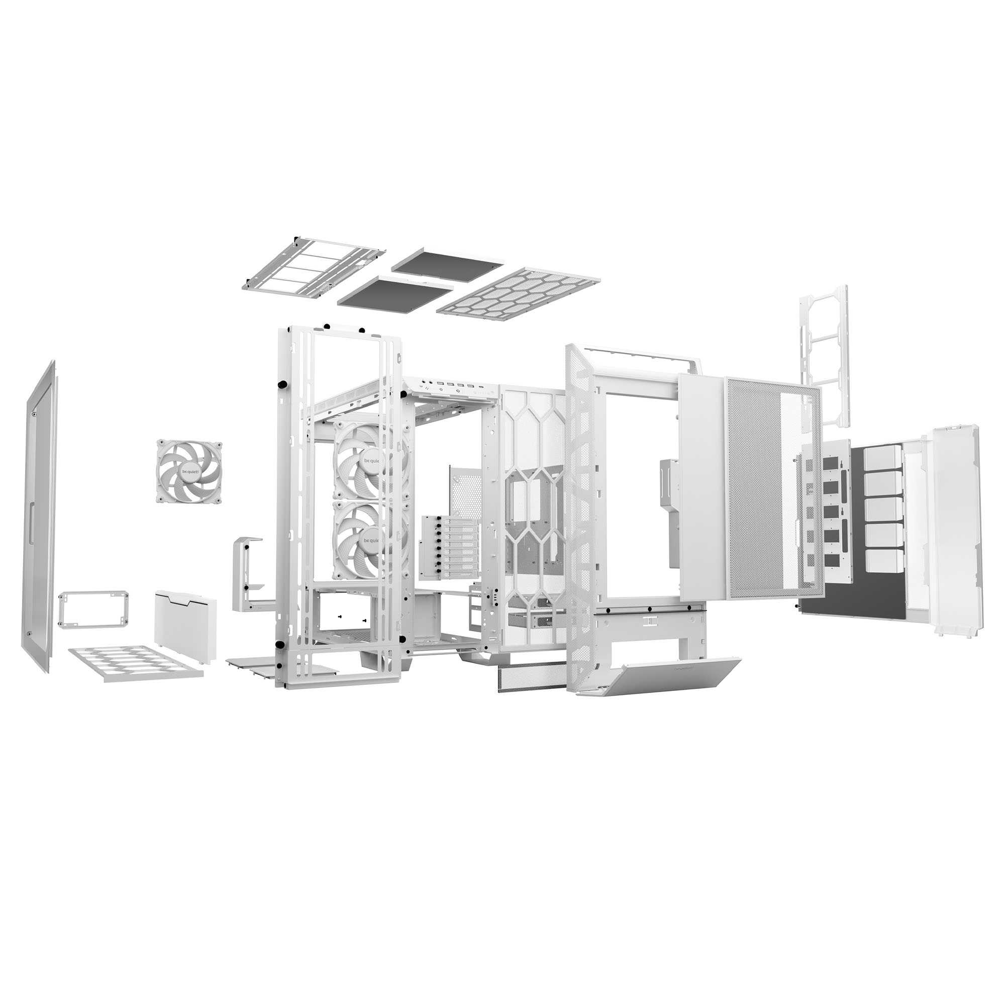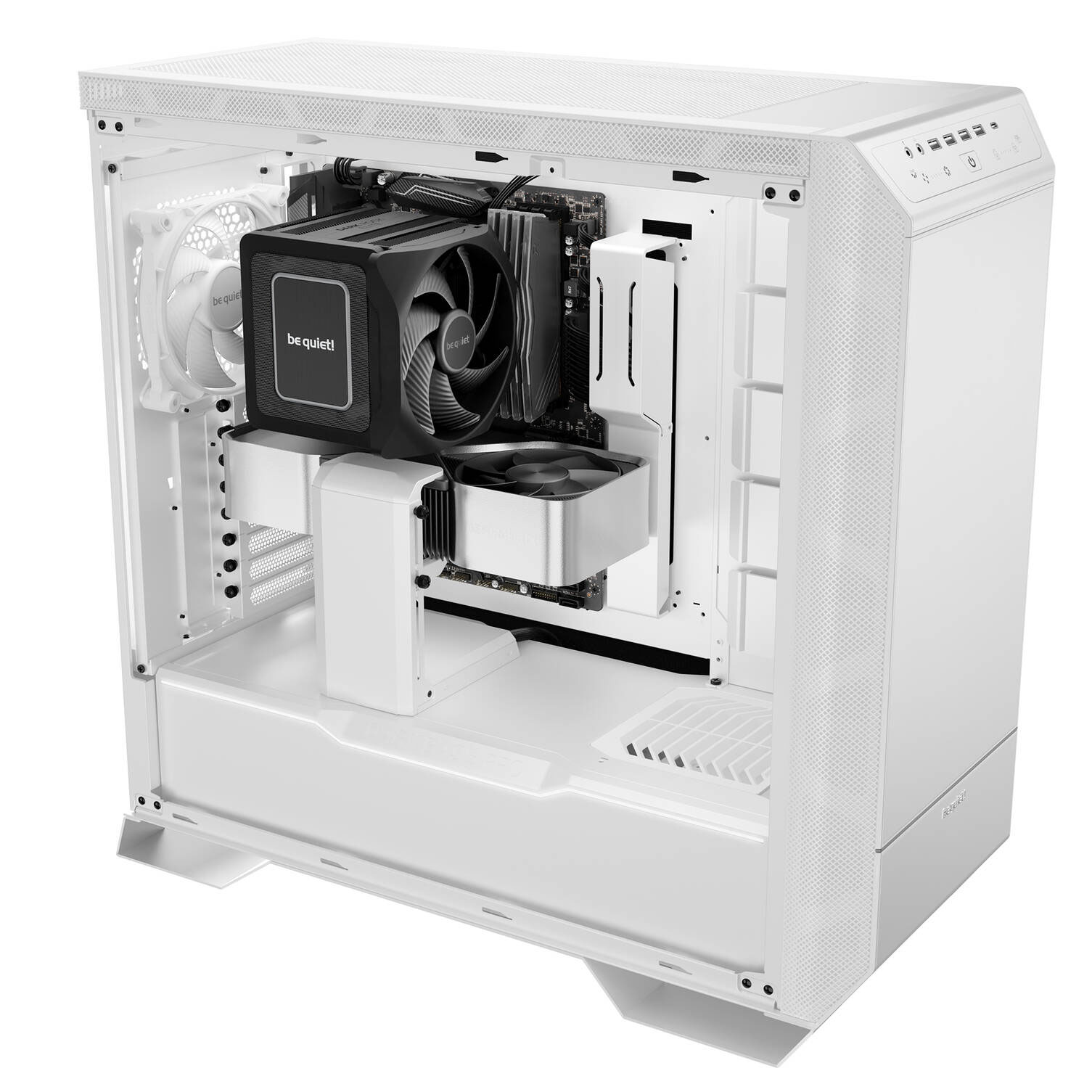 Include 3 ventole Silent Wings 4 da 140 mm PWM, ottimizzate per la pressione statica e la silenziosit?, montate in un sistema a staffa con hub integrato che semplifica l?installazione dei radiatori. Il case supporta schede madri fino al formato E-ATX e dispone di ampio spazio per radiatori fino a 420 mm nella parte frontale, superiore e laterale.