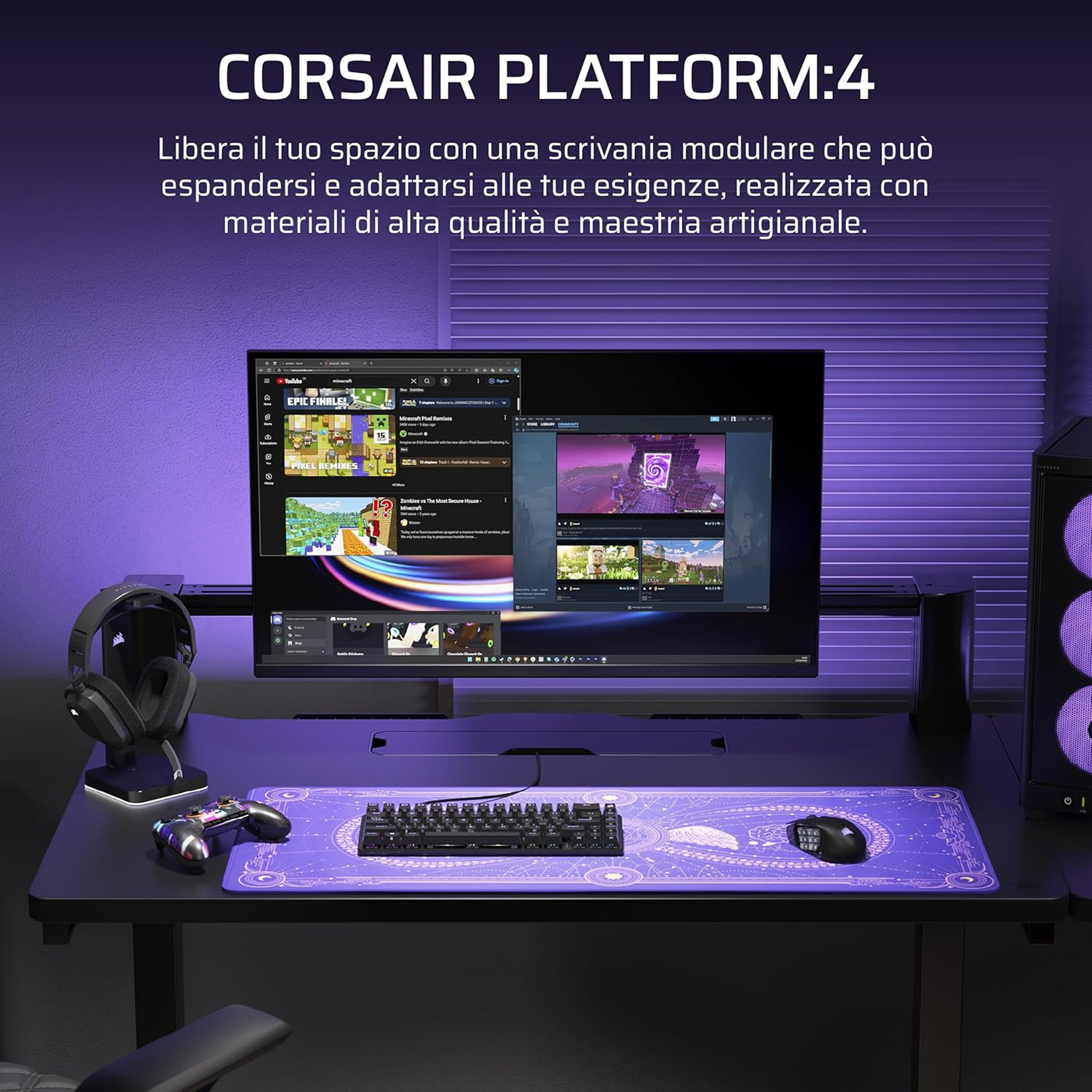 Rivoluziona la tua postazione di lavoro con la versatile scrivania CORSAIR Platform:4. Questa scrivania per computer con altezza fissa vanta il design della famiglia di scrivanie di punta di CORSAIR, con molteplici funzionalit?, in un superficie di 120 cm (4 piedi), per adattarsi a un?ampia scelta di ambienti.