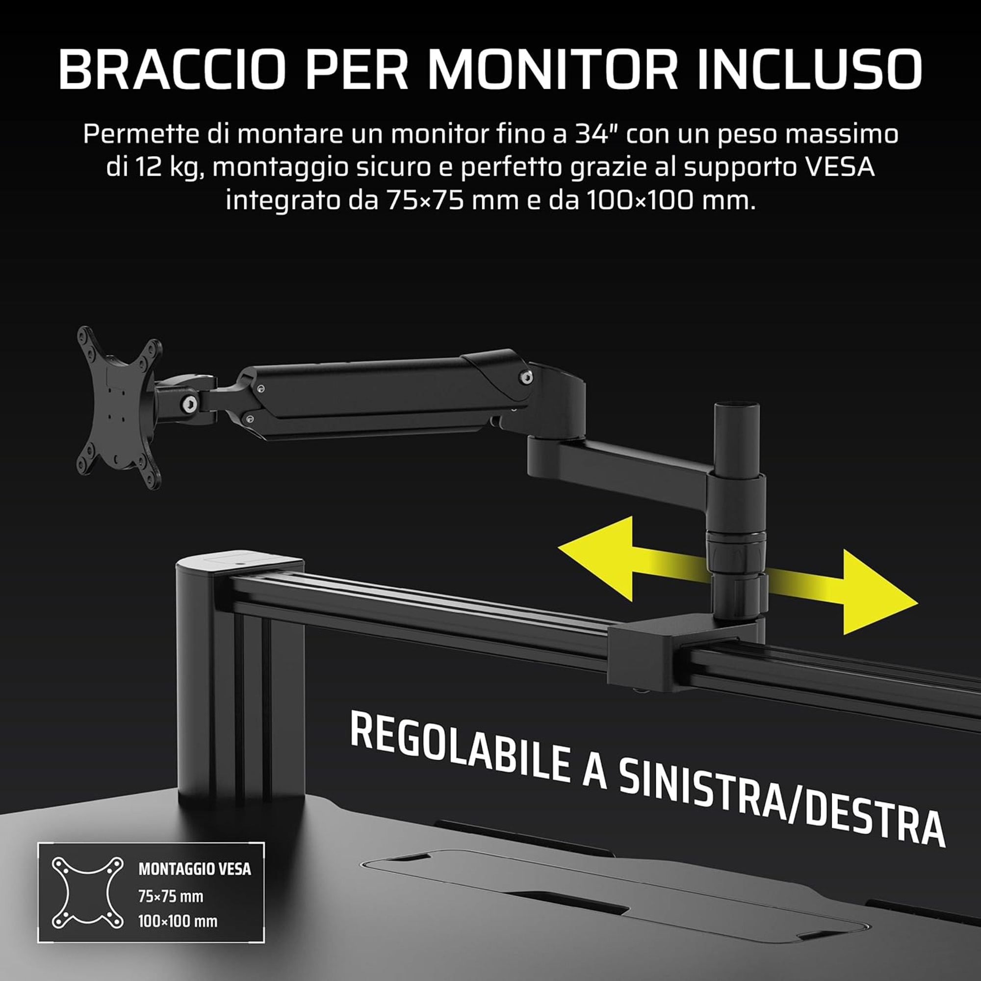 - Braccio per monitor: Incluso, compatibile con montaggi VESA 75x75mm o 100x100mm