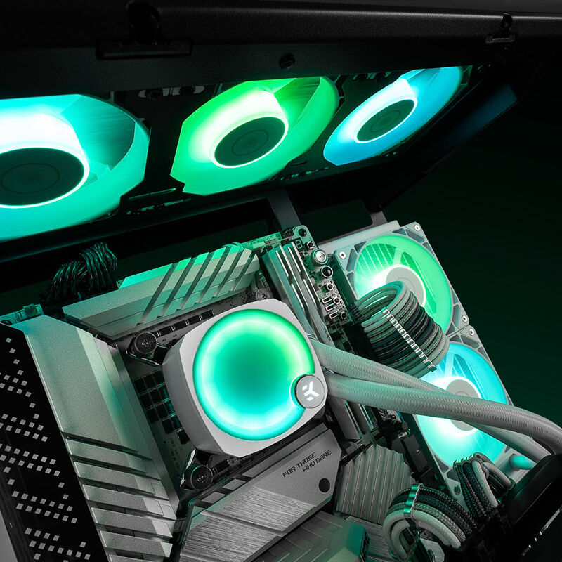 Insieme alle ventole EK-Vardar 120 D-RGB da 120 mm controllate PWM garantiscono un funzionamento silenzioso con la massima potenza di raffreddamento. Abbinando le prestazioni impressionanti.