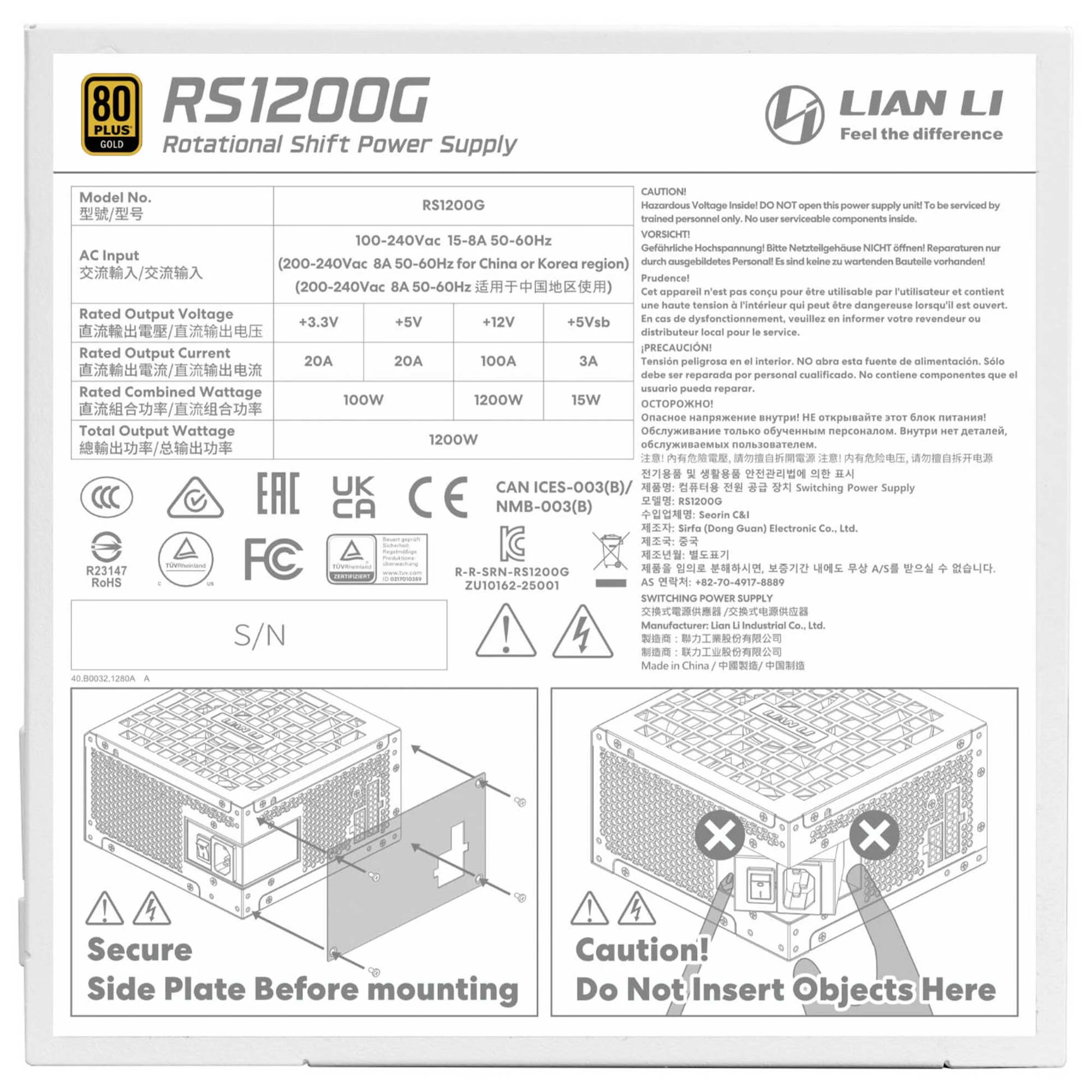 Una delle caratteristiche distintive della serie RS ? il design orientato alla gestione avanzata dei cavi: il connettore ATX 24 pin ? presente su entrambi i lati dell?alimentatore, consentendo un routing pi? semplice e ordinato. L?ingresso CA ruotabile offre ulteriore flessibilit? durante l?installazione, rendendo l?RS1200G un alimentatore estremamente versatile e adatto a build curate nei minimi dettagli.