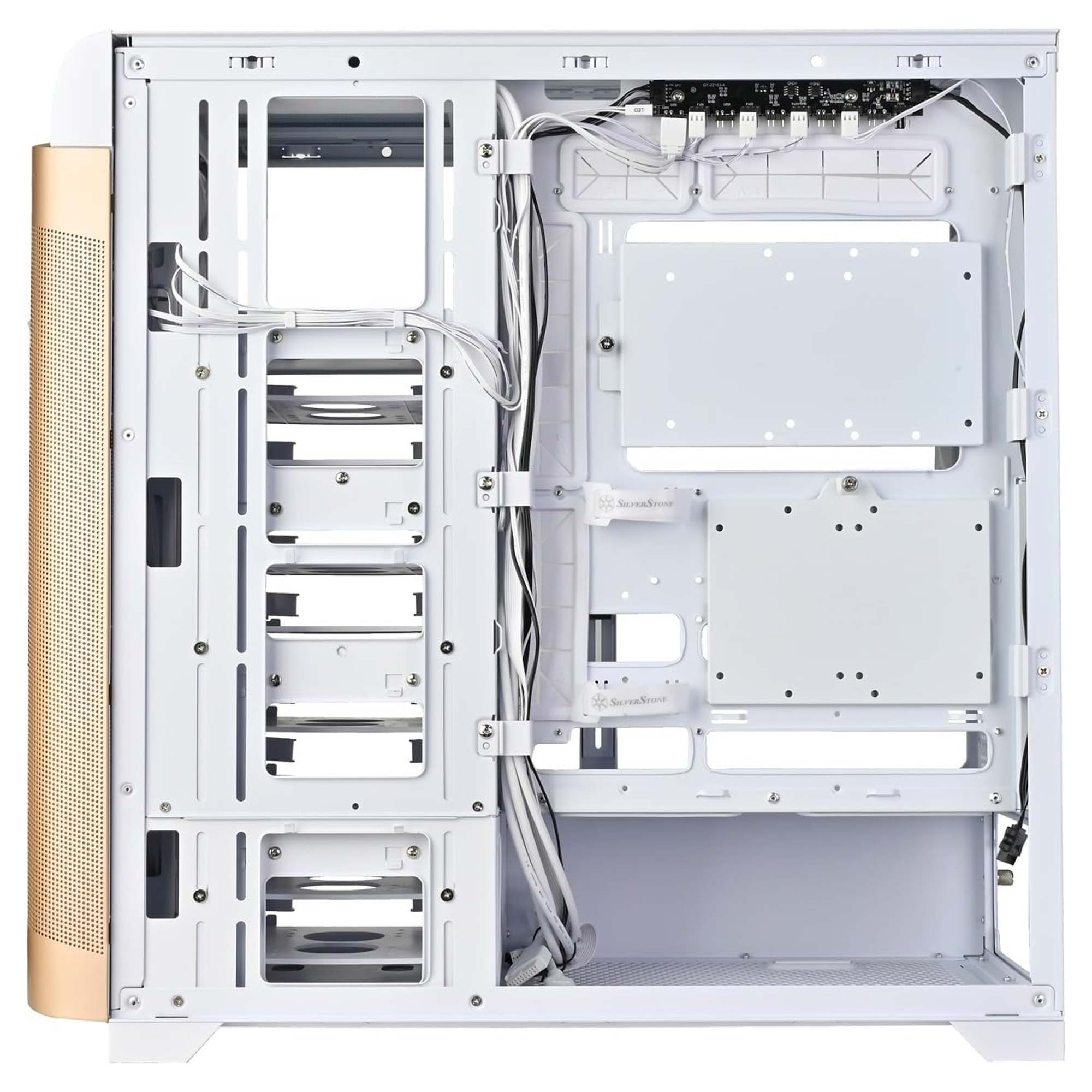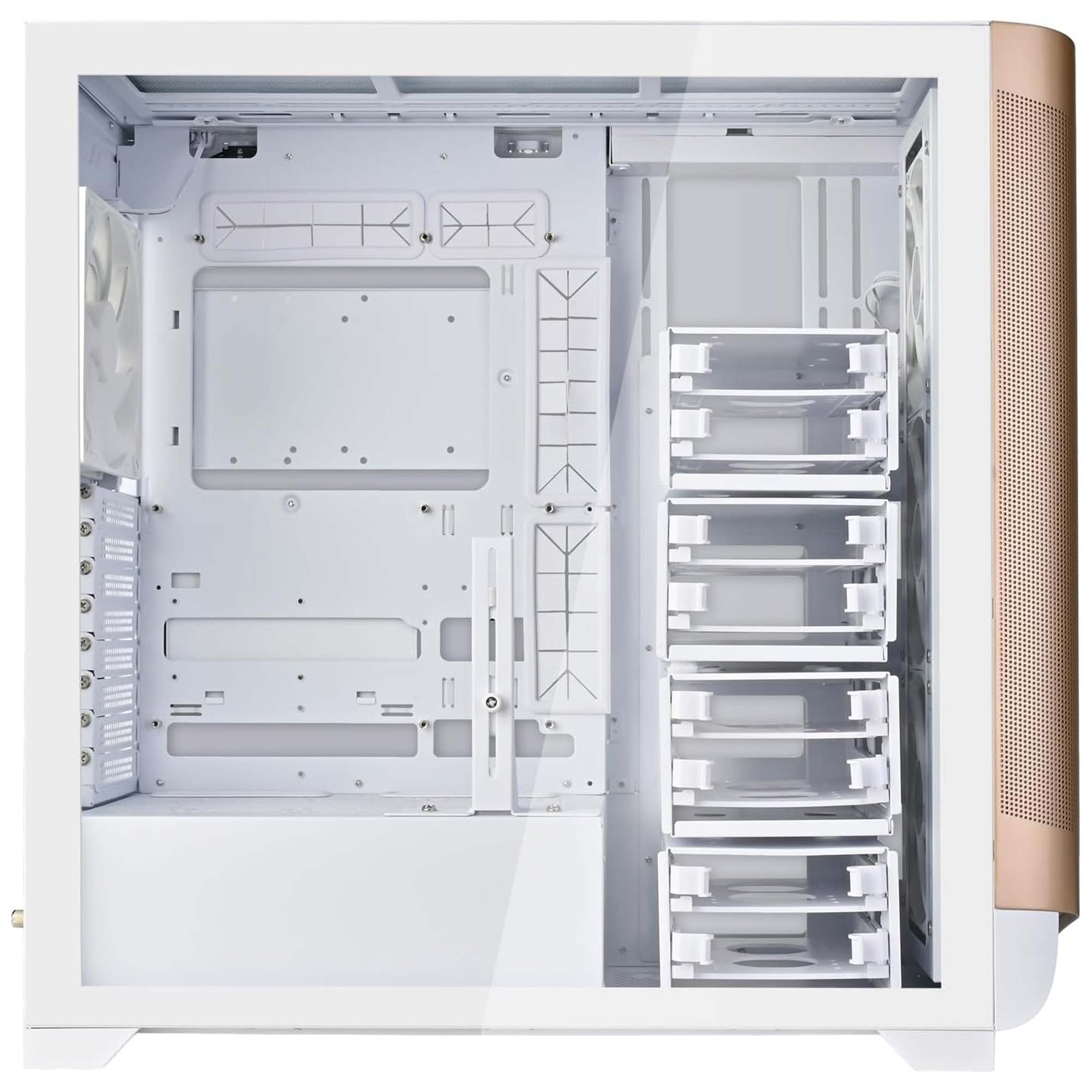 Il case supporta schede madri con connettori orientati verso la parte posteriore, compatibile con i design recenti di ASUS, GIGABYTE e MSI, oltre alla disposizione standard dei connettori. Offre spazio per schede grafiche fino a 438 mm, eliminando problemi di compatibilità con le GPU moderne. La capacità di raffreddamento è notevole, con supporto per l'installazione di undici ventole da 140 mm in totale e radiatori fino a 420 mm sui pannelli anteriore, laterale e superiore, ideale per componenti di fascia alta.