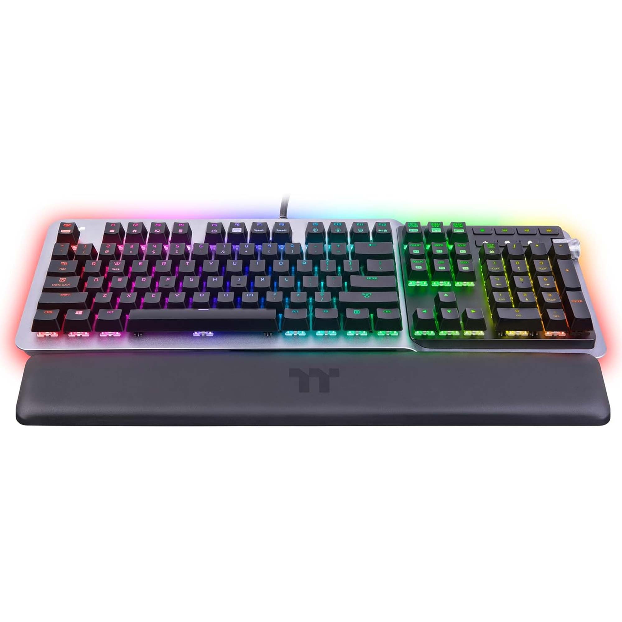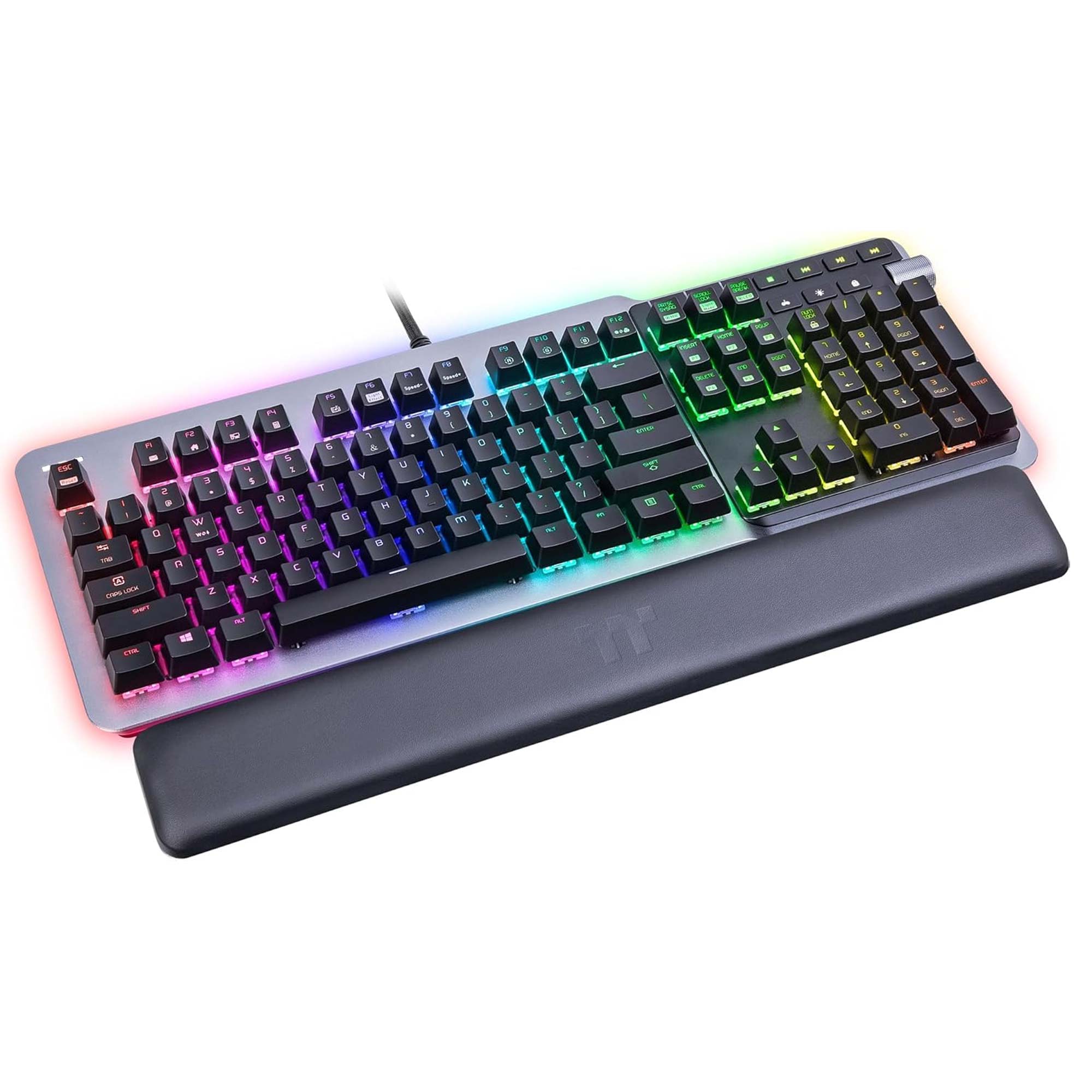 Dotata di illuminazione RGB a 360? sotto i tasti, offre 14 effetti personalizzabili e sincronizzazione con l?ecosistema TT RGB Plus e Razer Chroma tramite software iTAKE Engine. Il controllo volume con rotella stile car‑audio e i tasti multimediali agevolano l?uso quotidiano.