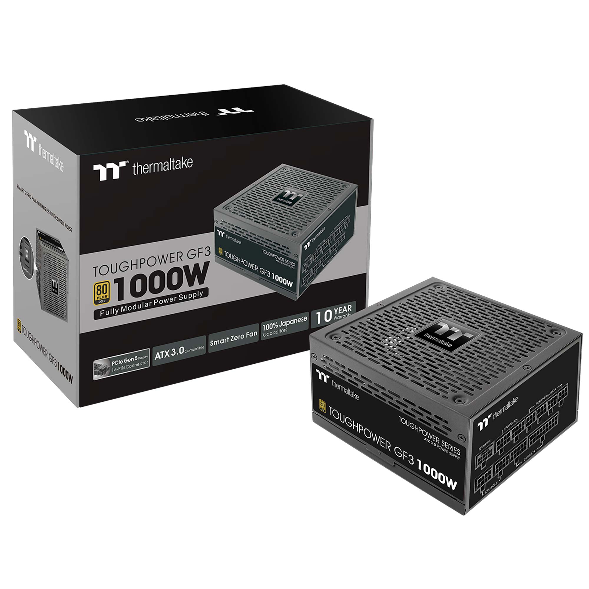 La serie Toughpower GF3 completamente modulare ? disponibile nelle versioni in diverse versioni ed ? costruita per offrire un’efficienza 80 PLUS Gold. Mirato a fornire le migliori prestazioni, il Toughpower GF3 1000W include tutte le caratteristiche critiche come un design a basso rumore di ondulazione <30 mV, una regolazione estremamente rigorosa della tensione 2%, tempo di mantenimento >17 millisecondi e viene fornito con condensatori giapponesi di alta qualit? al 100% e altri componenti premium per fornire energia continua e stabile.